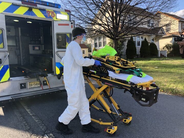 Teaneck Volunteer Ambulance Corps member Bobby Alexiou, 20, wheels out a stretcher outside the home of a potential COVID-positive patient in Teaneck, N.J., after suiting up in a protective suit, donated goggles from the local high school and an N95 mask. Karen Yi/WNYC hide caption