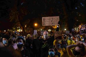 One altercation erupted about 5:30 p.m., the Los Angeles Police Department said in a news release. Police said it started when some people in a crowd of peaceful protesters “began to direct physical assaults on officers,” but video captured by KTLA-TV shows a police officer shoving a woman outside the U.S. Courthouse on First Street, prompting a man to run over and push the officer to the ground.