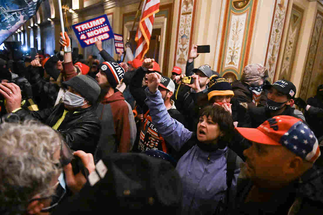 A mob breached security and stormed inside the U.S. Capitol on Jan. 6. The woman in blue with her fist raised was later identified as Suzanne Ianni.