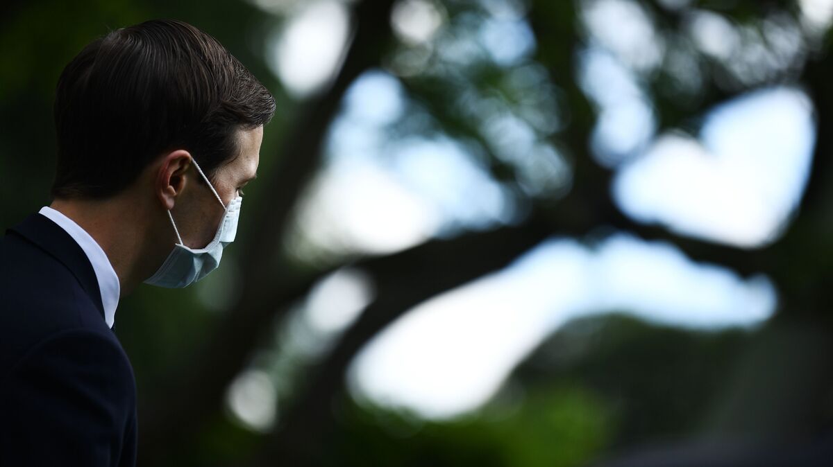 Jared Kushner, President Trump’s son-in-law and senior adviser, looks on while wearing a mask as Trump holds a news conference in the Rose Garden on Monday. Brendan Smialowski/AFP via Getty Images hide caption